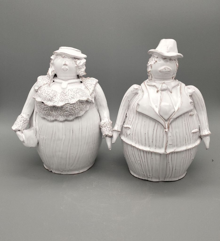 La donna indossava un elegante abito decorato con merletti. Il marito, vestito con un completo, camicia, cravatta e cappello, guardava con orgoglio la sua amata, ammirando la sua bellezza e classe.