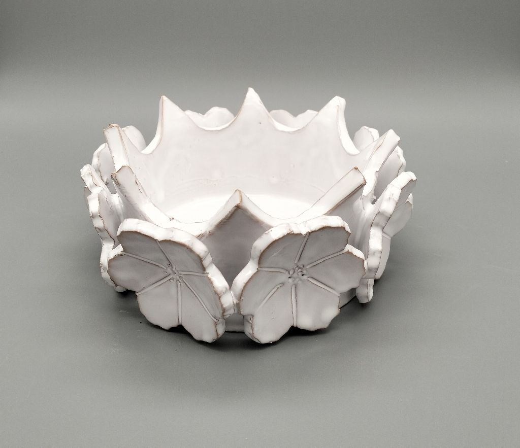 La ceramica bianca offre un aspetto elegante e pulito, mentre i dettagli in rilievo, come i fiori, arricchiscono il pezzo con texture e profondità.